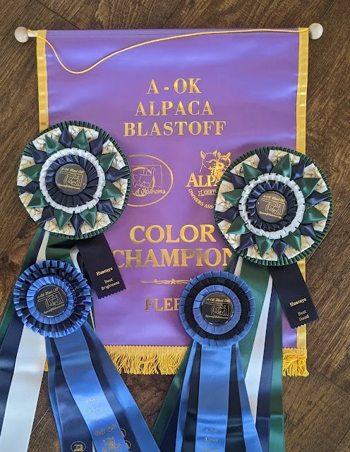 In the fall of 2023, we focused on showing our fleeces at two AOA certified fleece shows in different parts of the country-the VAOBA IFA Show and the A-OK Alpaca Blastoff. Our fleece entries didn’t disappoint! We entered 3 fleeces in each show, and took home several First Place ribbons, 2 Championships, Best Brightness and Best Hand specialty awards, and the coveted Spirit of the Industry award!